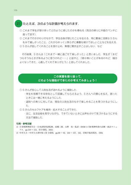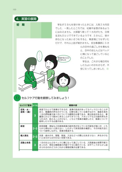 ●精神看護学の基本的な考え方や技術・技法について復習でき、実習の流れに沿って、「看護計画のための情報の整理」、「看護計画の実際」、「カンファレンスと実習の振り返り」という順序で構成。「看護計画の実際」では、各精神障害別に、それぞれの障害に関する基本的な知識と看護のポイントを押さえつつ、学生と患者とのストーリー展開を通して、看護計画の立案が学べるよう工夫した。