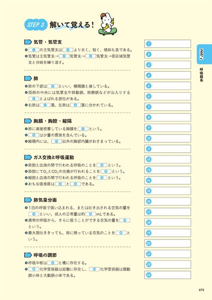 気管・気管支/肺/胸膜・胸腔・縦隔/ガス交換と呼吸運動/肺気量分画/呼吸の調節/解いて覚える!