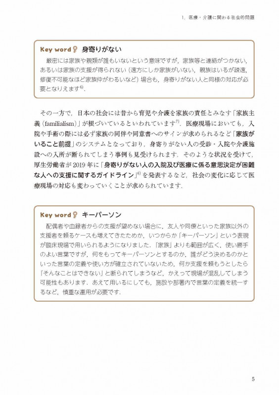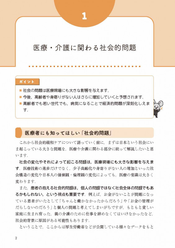 そのため本書では,多岐にわたる社会的な問題の中でも,医療者が特に経験することが多いと思われる「お金の問題」,「“身寄りがない”という問題」,「介護の問題」の3 つのテーマに絞り,知っておくと役立つ知識や実践例をまとめました.