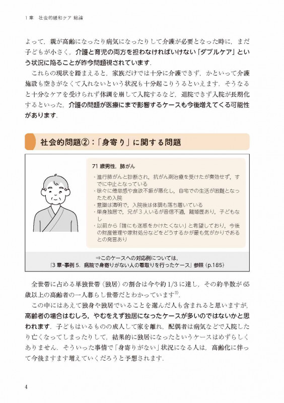 さらに2 章では,医療の枠内だけでは社会的緩和ケアを十分に語ることができないと考え,医療者だけでなく,病院外で働く様々な専門職の皆様にも執筆をお願いしました.
