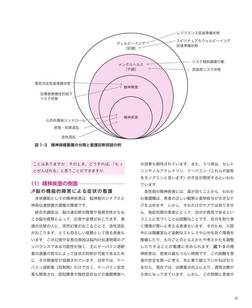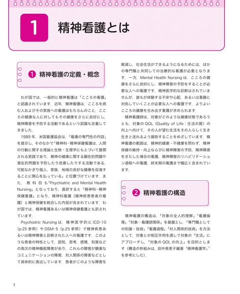 ●第1章では、精神看護の定義や概念、構造について述べたうえで、精神看護における看護過程を解説。精神障害者特有の情報収集やアセスメントのポイント、健康課題の抽出、計画、実施、評価まで示すとともに、全人的視点と精神看護とのつながりについて概説した。