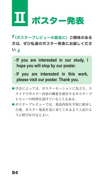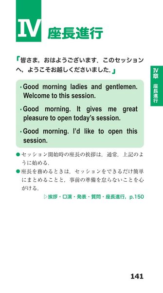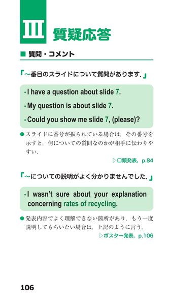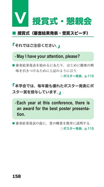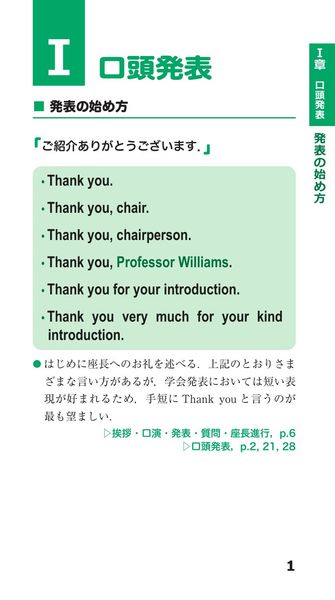●発表で使う表現はもちろん、質疑応答(質問する側/質問される側)、座長進行、授賞式など、国際学会の朝から晩までのあらゆる場面を網羅していて、いざというときに頼りになります!